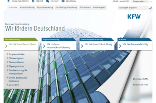 Interessenten können sich auf den neuen KfW-Websites jetzt noch einfacher und schneller über die für sie relevanten Produkte informieren: Ein neuer Programmfinder bündelt alle Informationen zu Fördermitteln und Krediten der KfW. Über dessen intuitive Benutzerführung gelangen Besucher schnell zum passenden Förderprogramm. Durch die gut strukturierte Navigation behält der Nutzer auf den rund 4.200 Unterseiten von www.kfw.de immer den Überblick. Internationalen Interessenten stehen die Webseiten auch englischsprachig zur Verfügung. Die webbasierte Interaktion mit Privatpersonen, Unternehmen, Kommunen und Beratern ist wichtig für die Förderbank des Bundes und der Länder; immerhin verzeichnet die KfW-Bankengruppe monatlich bis zu einer Millionen Website-Zugriffe.