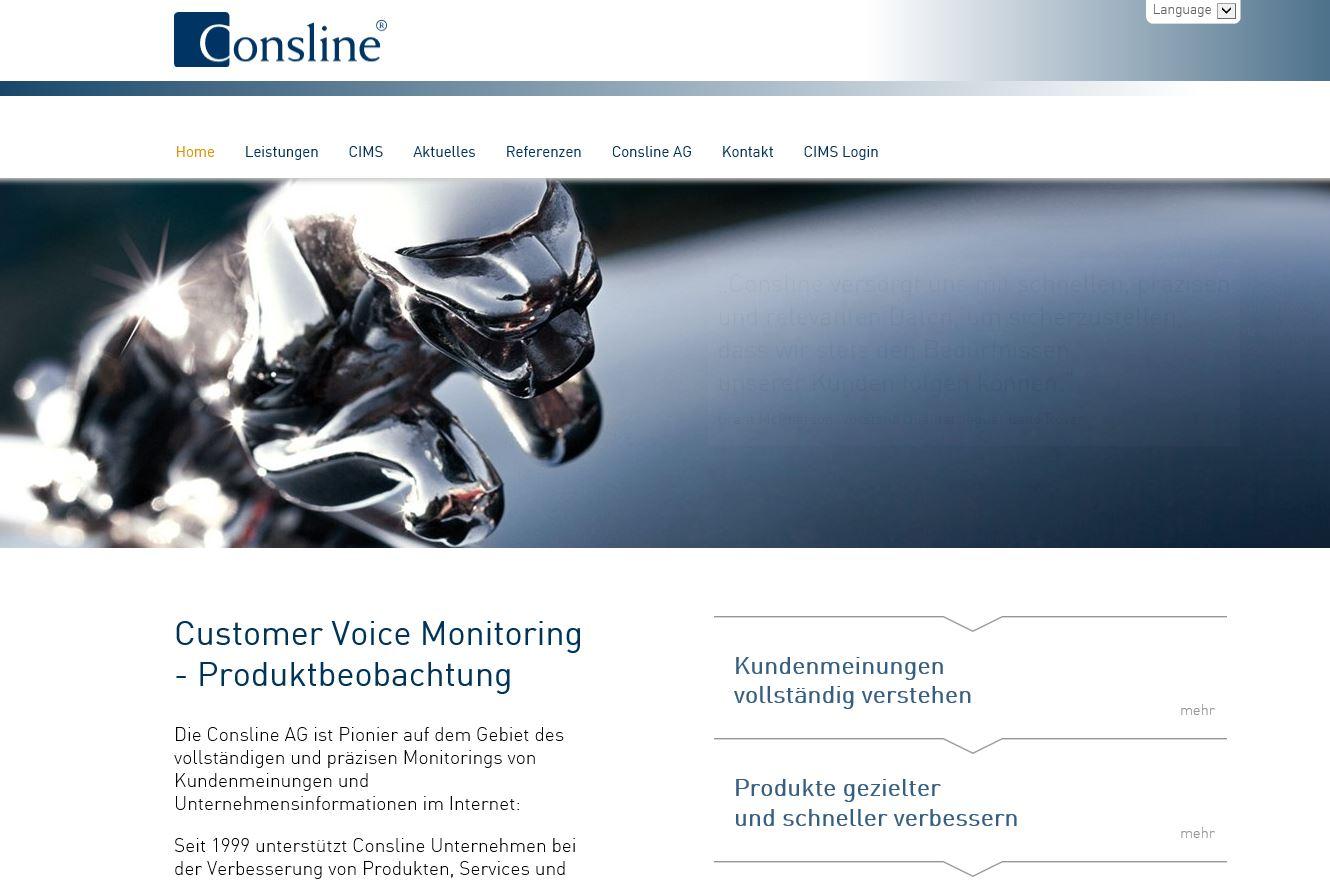 Die Consline AG ist Pionier auf dem Gebiet des vollständigen und präzisen Monitorings von Kundenmeinungen und Unternehmensinformationen im Internet: Seit 1999 unterstützt Consline Unternehmen bei der Verbesserung von Produkten, Services und Kampagnen sowie einer zuverlässigen Produktbeobachtung. Die Customer Voice Monitoring Leistungen von Consline liefern Erkenntnisse auf der Basis von echten Kundenstimmen. Alle relevanten Beiträge aus sämtlichen Online-Quellen werden durch branchenerfahrene Muttersprachler analysiert und bewertet und dann auf Basis des eigens entwickelten Consline Intelligence Management Systems (CIMS) den Kunden zur Verfügung gestellt.