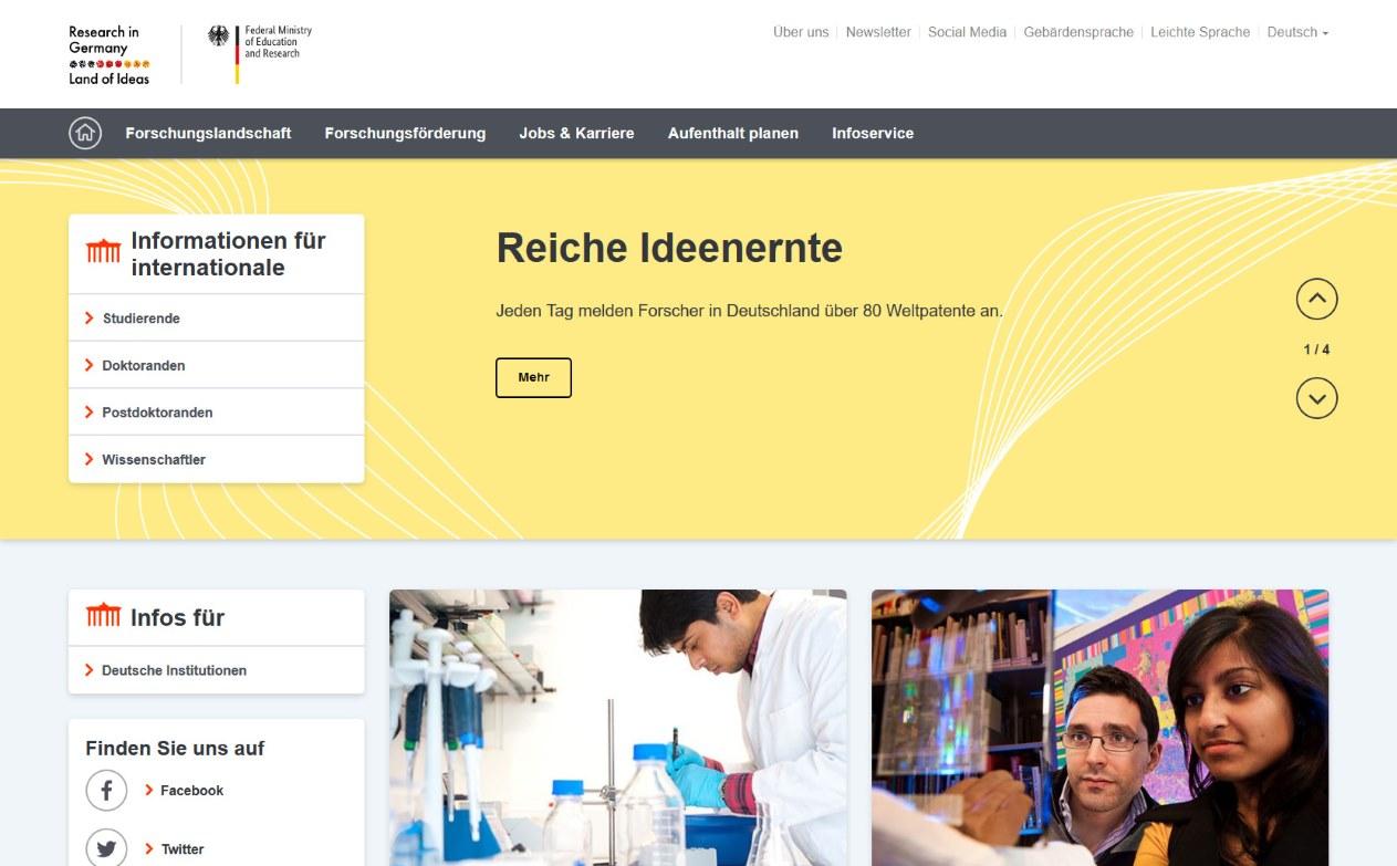 www.research-in-germany.org ist die zentrale Informationsplattform für die Kampagne „Research in Germany“, die unter anderem das Ziel verfolgt, die Zahl hochqualifizierter internationaler Wissenschaftler an deutschen Forschungseinrichtungen zu steigern sowie neue Forschungskooperationen anzustoßen. Herausgeber dieser Plattform ist das Bundesministerium für Bildung und Forschung (BMBF), redaktionell betreut wird sie vom DAAD.